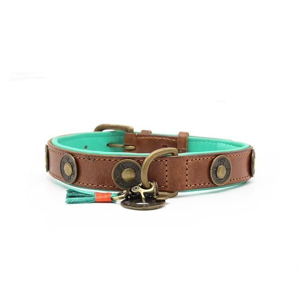 Draagt jouw hond de Dog with a Mission Halsband Urban al? Deze super stoere halsband is gemaakt van tuigleer. Tuigleer is een dik, stevig en sterk leder dat prima tegen een stootje kan. De binnenkant van deze halsband is gemaakt van zacht turquoise leer. De buitenkant van de halsband is afgewerkt met messing details.