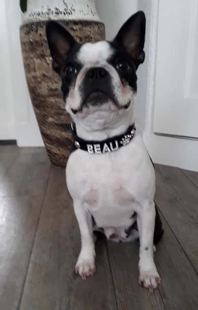 Hondenhalsband met naam Medium Black Deze zwarte halsband is gemaakt van dubbellaags leer en is gevoerd met kalfsleer. Wat is er leuker dan een mooie leren halsband met de naam van uw huisdier in fraaie stras letters op de halsband ? Een echt uniek exemplaar voor uw hond, waarmee u en uw hond zeker op zullen vallen ! Op deze hondenhalsband is er plaats voor een naam van maximaal 7 letters. De letters worden door ons op de halsband geplaatst ! Als u een decoratief element toe wilt voegen (een kroontje of een pootje), kunt u per element 2 letters minder plaatsen daar deze elementen ongeveer tweemaal zoveel plaats innemen als een letter. Een kroontje of een pootje dient u apart toe te voegen aan uw bestelling. Losse letters of de halsband zonder letters zijn apart te bestellen, neemt u daarvoor even contact met ons op. Let op dat u in het vakje ‘naam van de hond’ de naam invult, anders kan de bestelling niet worden afgerond. Bepaal de juiste maat voor uw hond: